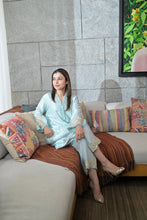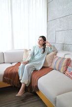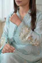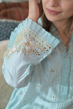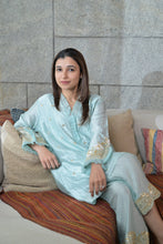 Breezy mirror and pearl kurta paired with flared pants creats a harmonious look.