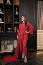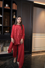 Striking short kurta with full embroidery highlighted with sequins and cutdana is elevated by a dhoti style pant and dupatta. Perfect for festive gatherings and pre-wedding celebrations.