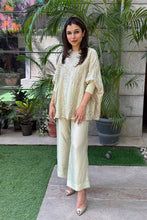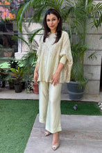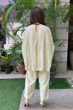 Free size cape paired with culot pants embroidered with thread and sequins beading give a free flowing chic look.