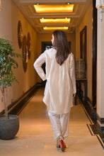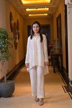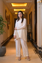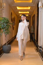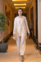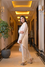 White sequins and pearl embroidery on collar and sleeves of shirt paired with embroidery on pants.